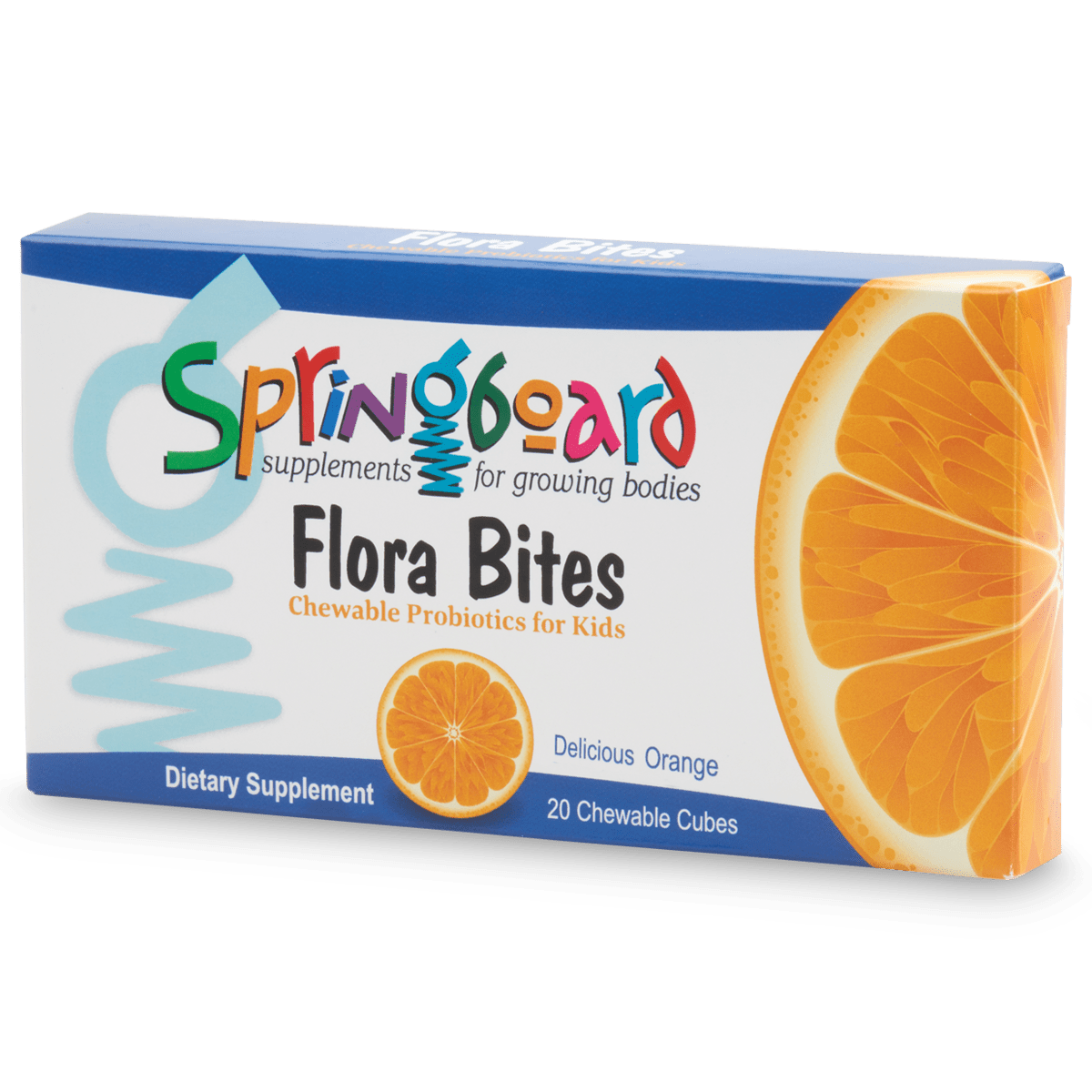 Flora Bites is a delicious, chewable probiotic formula for children, designed to promote healthy gut microflora, protect intestinal integrity and support immune function. Each creamy, natural orange-flavored cube contains a 5 billion CFU blend of Lactobacillus acidophilus and Bifidobacterium lactis, as well as 20 mg of vitamin C for comprehensive digestive and immune system support. The strains in Flora Bites have been carefully selected for their survivability and adherence to the intestinal tract. The chewable cube form is an easy, fun way for children to achieve optimal probiotic support and a tasty alternative to a capsule or powdered probiotic.